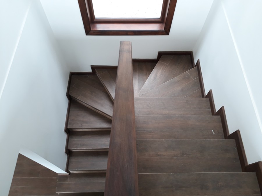 Escalera de hormigón armado y revestida en palmetas de porcelanato con textura madera