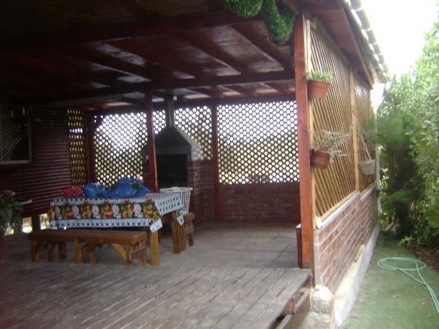 Terraza realizada en Santiago hecha de madera con plancha de pizarreño imitación teja chilena, con piso de cerámica tipo pastelón.